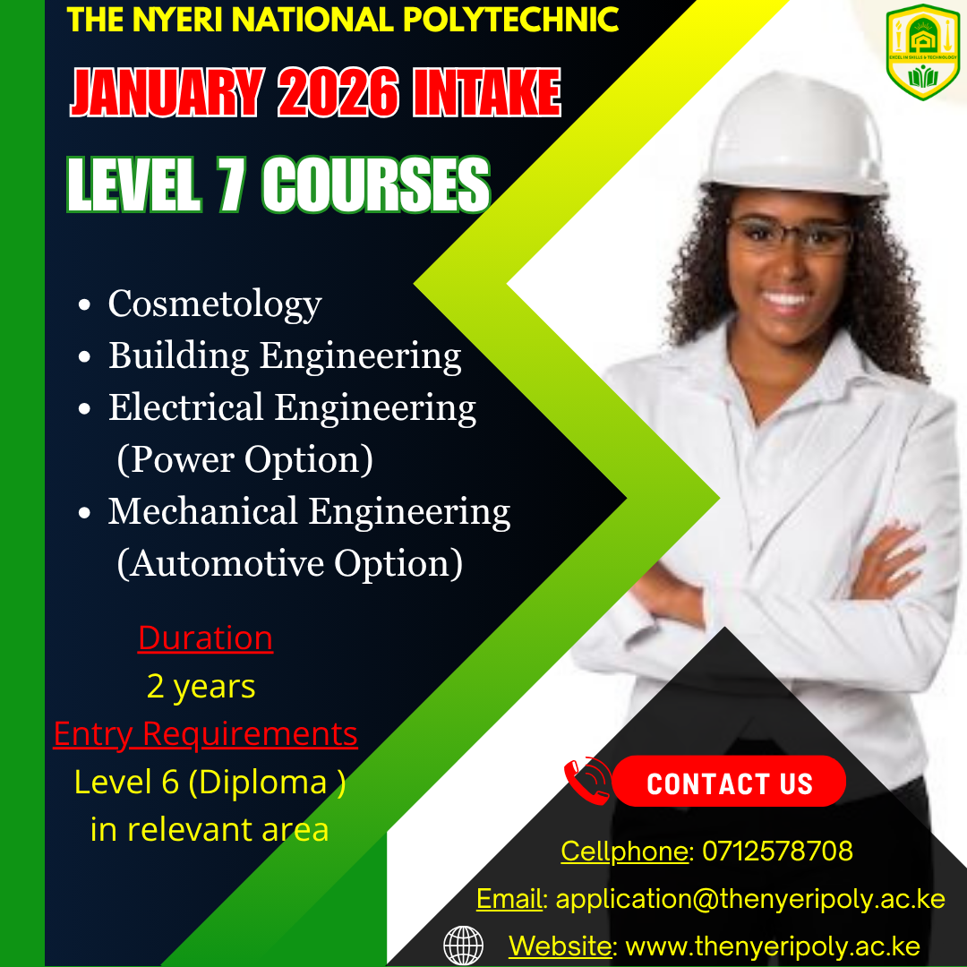 At The Nyeri National Polytechnic, we prepare you to launch your career by providing a supportive, creative, and professional environment from which to learn practical skills.