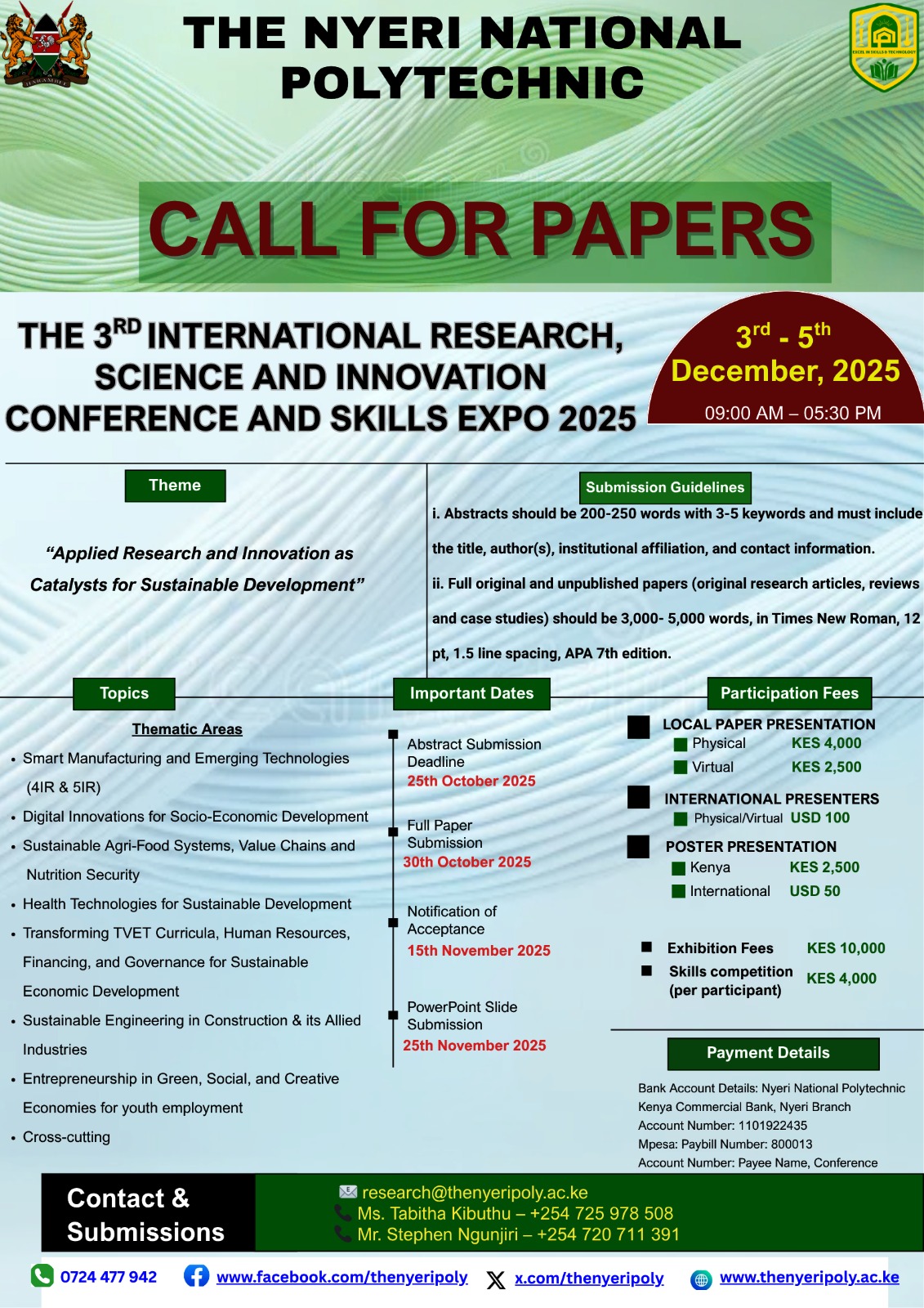 Participants are invited to submit original research aligned with sub-themes such as green skills, digital transformation, inclusivity in training, and demand-driven partnerships. Accepted papers will be published in the Nyeri National Polytechnic Research Journal.